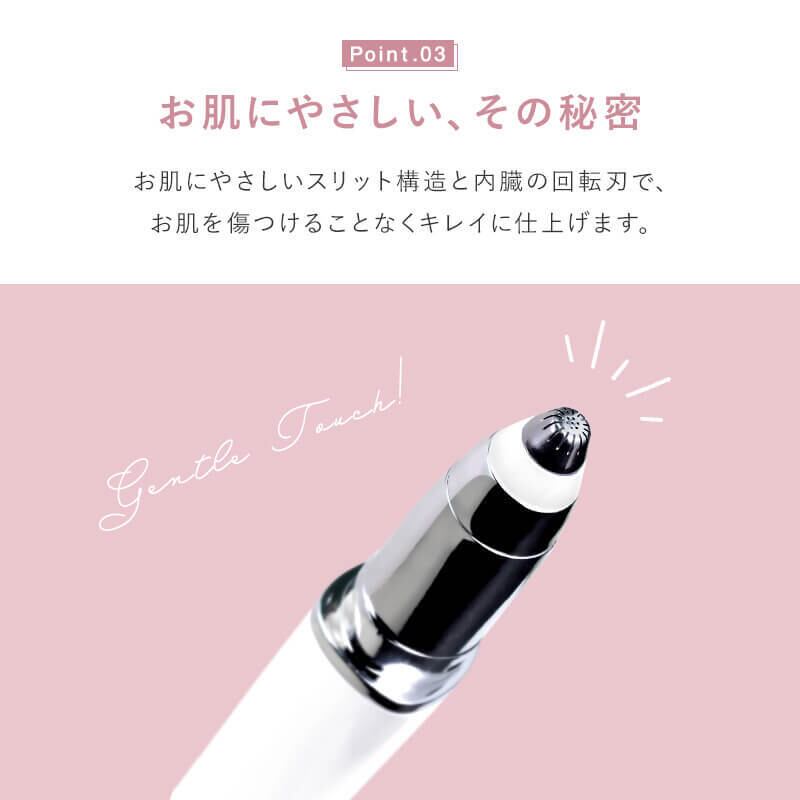 繊細な眉まわりやくちもと専用に設計されたアイブロウシェーバーで、左右対称の美眉があっという間に完成。