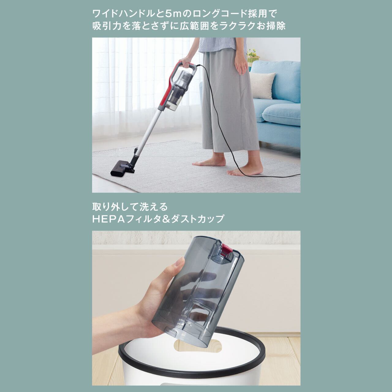 ワイドハンドルと約5mのロングコードで、部屋の隅々までスムーズにお掃除が可能です。